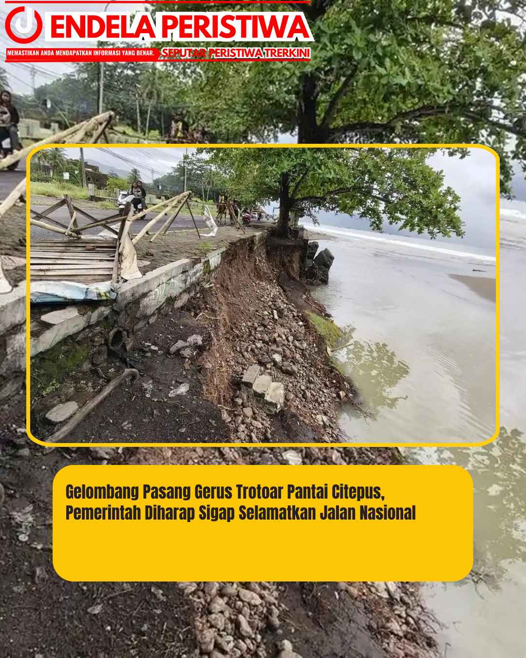 www.JendelaPeristiwa.com.ǁJawa Barat,7 November 2025-Trotoar Jalan Raya Citepus tepatnya di Pantai Muara Citepus, Desa Citepus, Kecamatan Palabuhanratu, Kabupaten Sukabumi, Jawa Barat, tergerus akibat gelombang pasang yang terjadi.