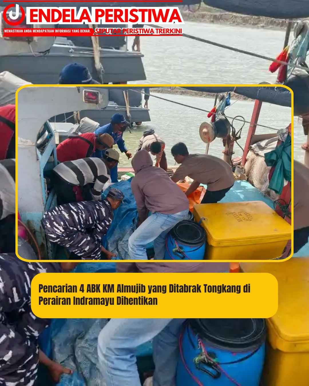 www.JendelaPeristiwa.com.ǁJawa Barat,9 Maret 2026-Operasi SAR pencarian empat anak buah kapal (ABK) KM Almujib yang ditabrak kapal tongkang di perairan sekitar Pulau Rakit atau Pulau Biawak, Kabupaten Indramayu, resmi dihentikan.