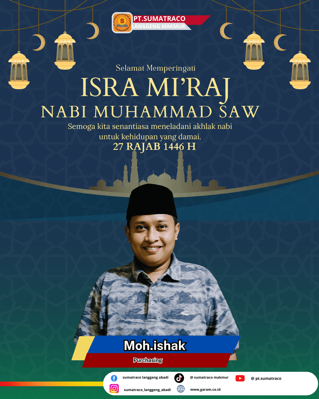 PT. Sumatraco Langgeng Makmur juga mengajak semua pihak untuk selalu bersyukur dan menjaga ketenangan batin dalam menyongsong kehidupan yang lebih baik, serta mengedepankan nilai-nilai kemanusiaan yang universal, yang selaras dengan esensi dari peringatan Isra’ Mikraj itu sendiri.